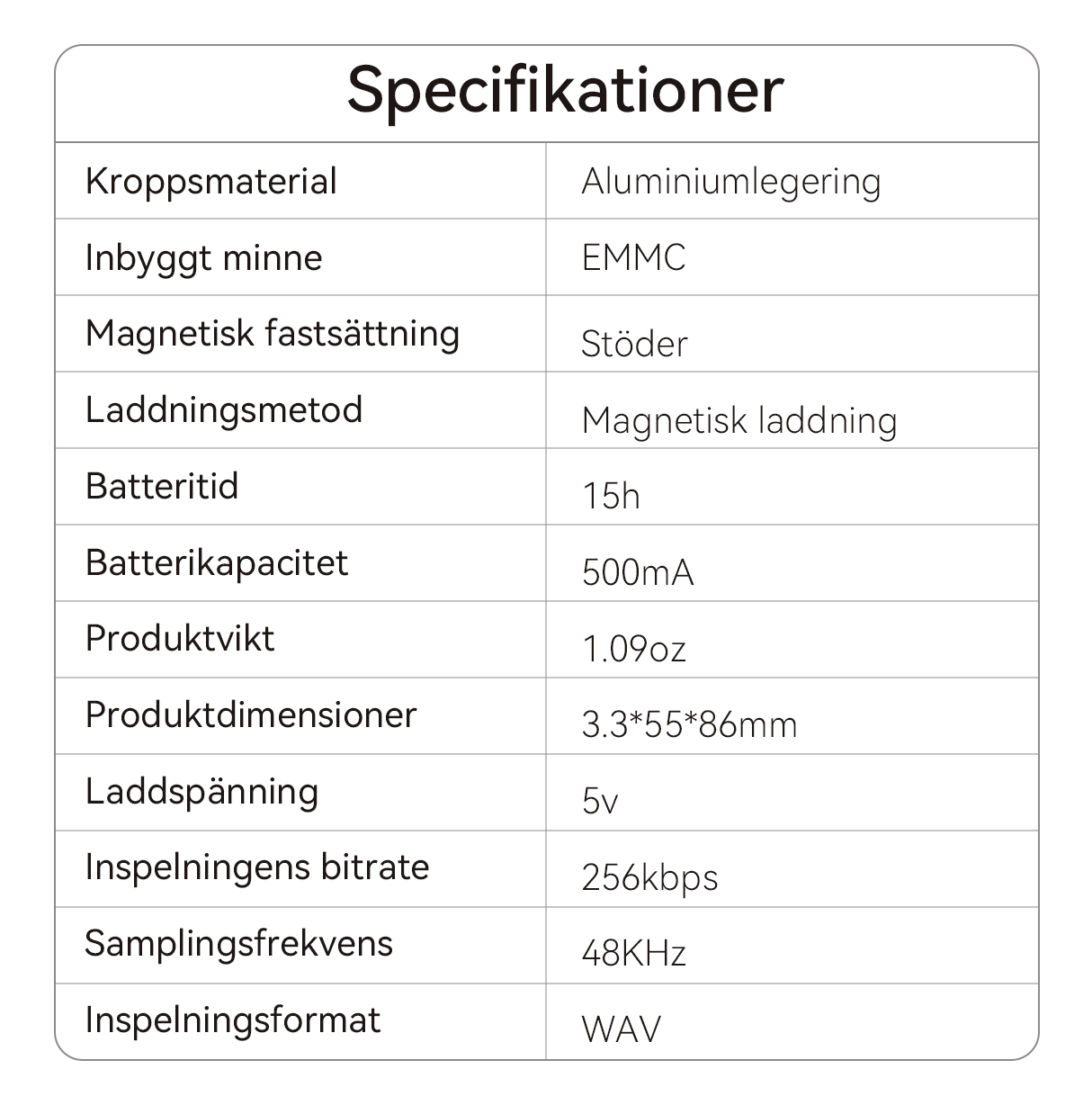 - Samtalsinspelning: Magnetisk design gör det enkelt att spela in samtal och konferenser.
