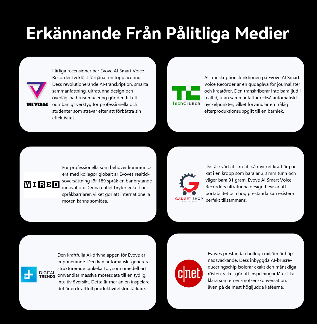 Resultatet blev Evove AI Smart Voice Recorder. Den kombinerar en kraftfull AI-motor för realtidstranskribering med en ultratunn design och inbyggd brusreducering för perfekt ljudkvalitet. Detta är Evoves kärnlöfte: att frigöra ditt sinne så att du kan fokusera på det som verkligen räknas.